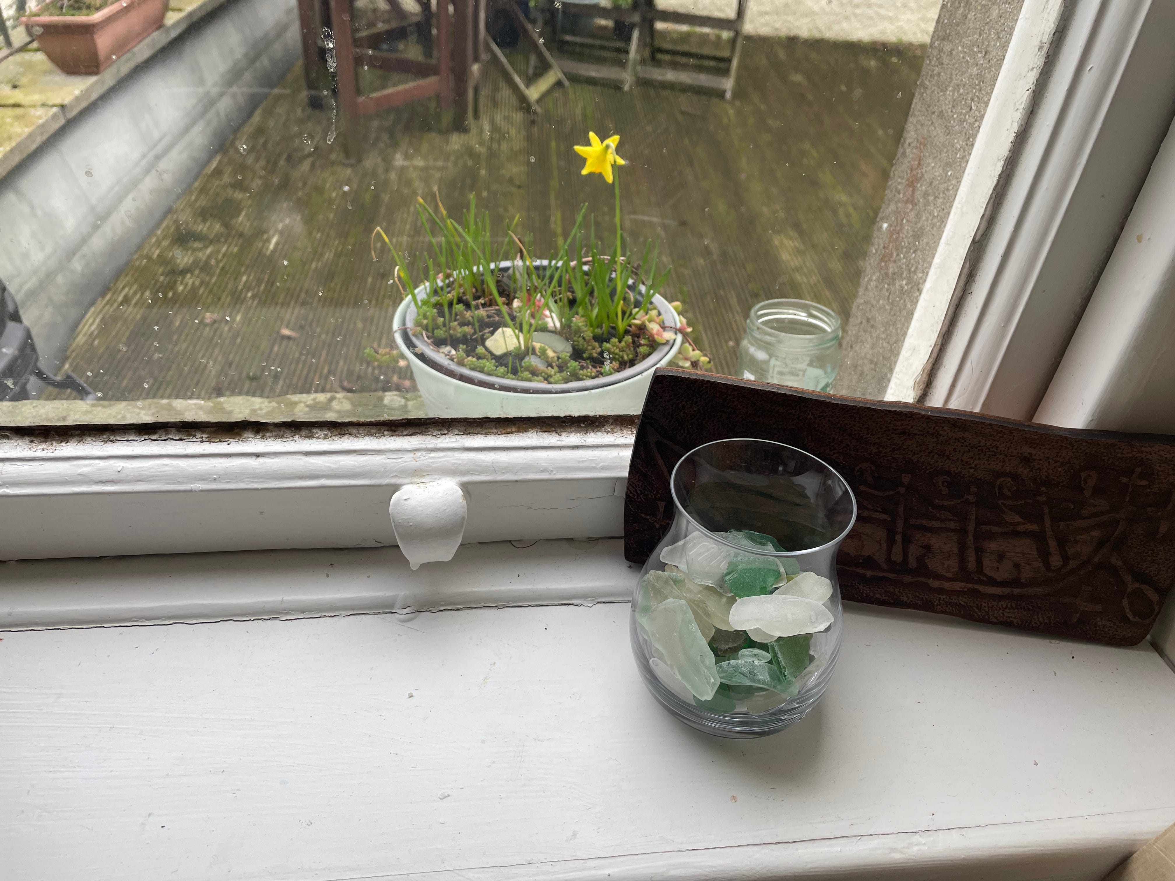 A first tiny daffodil blooming outside my kitchen window, from bulbs I did not plant!