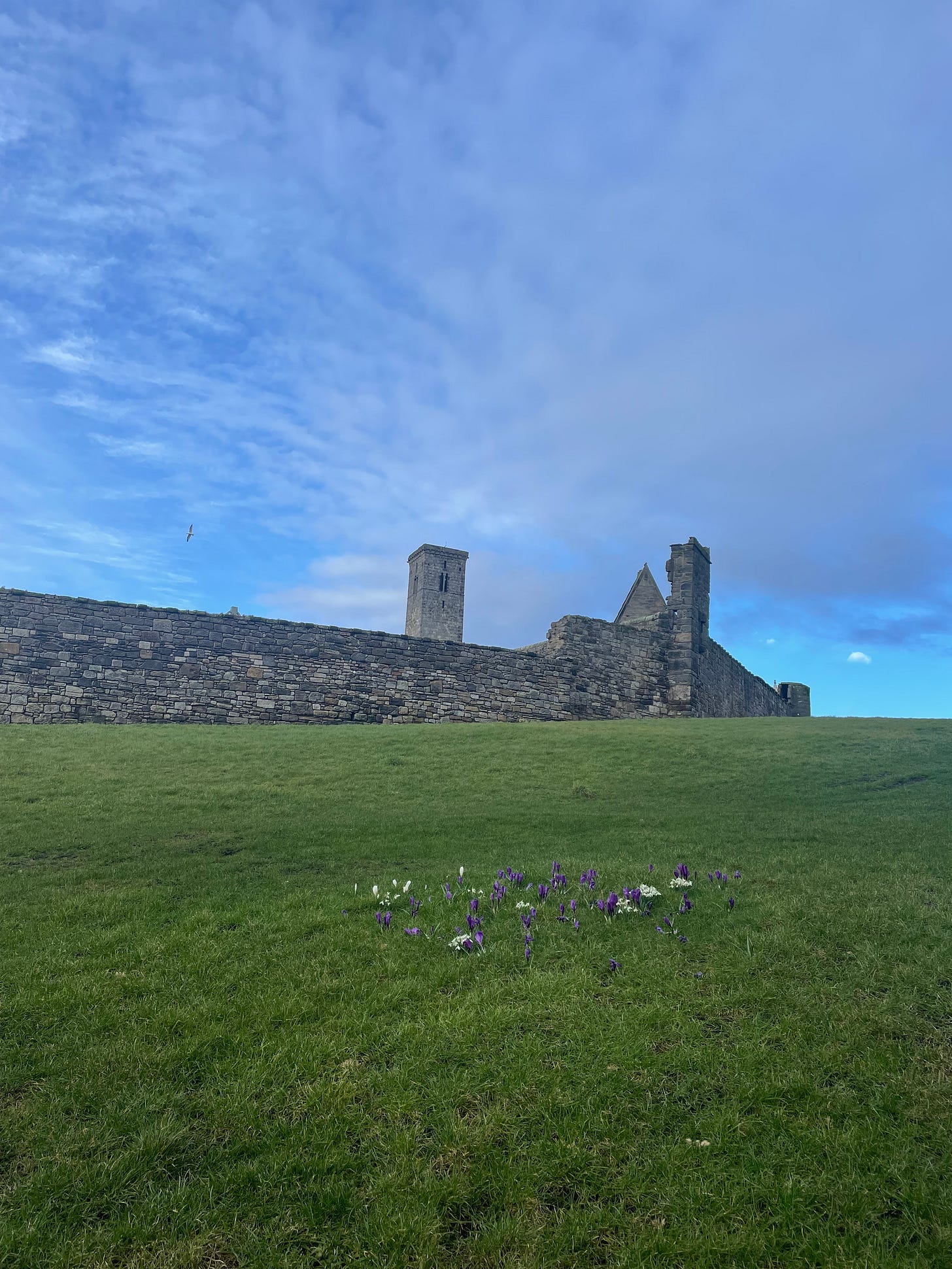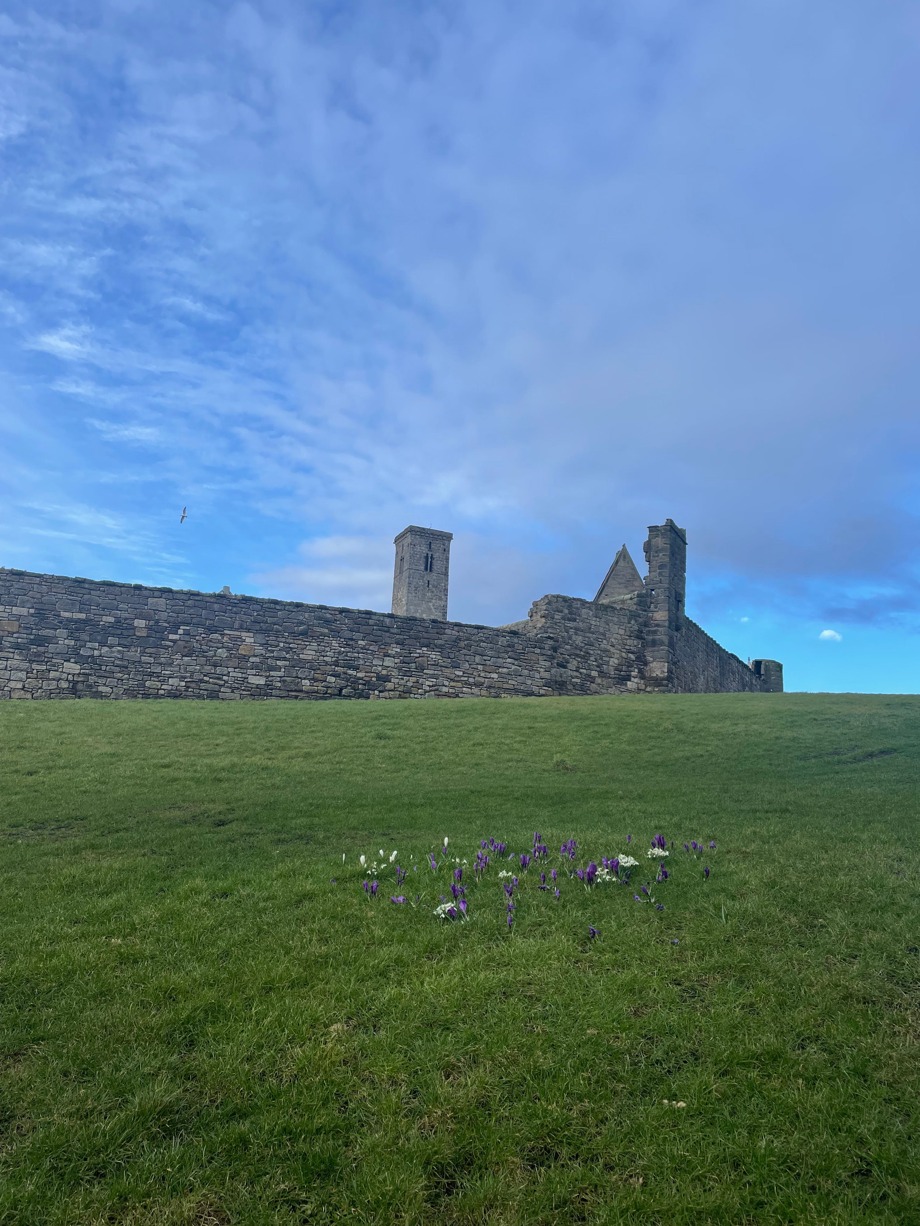 A small convening of snowdrops and crocuses outside the cathedral ruins: